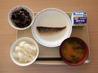 今日の給食は、ごはん、牛乳、マホッケの塩焼き、ひじきの煮物、じゃがいもとたまねぎのみそ汁です。
