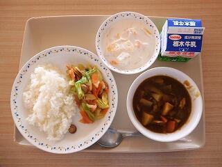 今日の給食は、ごはん、牛乳、ポークカレー、野菜ソテー、フルーツヨーグルトです。