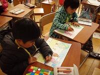 来入児の子どもたちは2年生の教室で学校についての発表を聞いたり、ぬりえをしたり、手遊びをしたりと楽しく過ごしました。
