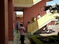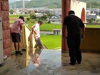 各教室、特別教室の窓ふきや掃除、校庭南側の側溝掃除、非常階段掃除、農園の除草など、