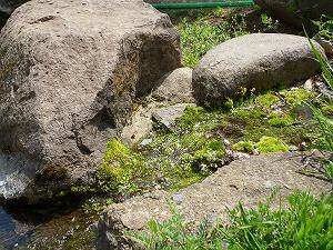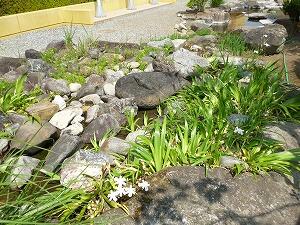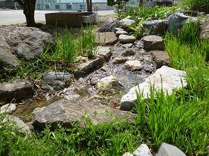 業務員が修繕し、職員室前の小川が復活しました。