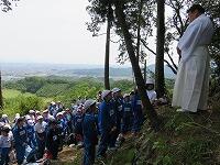 ↑ 急な山道を登って、ようやく山頂に到着!!山頂では、宮司さんからお話を聞き、みんなでお昼を食べました