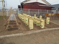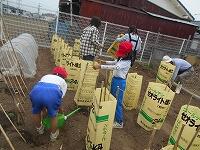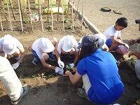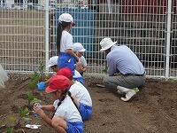 5月9日、地域の野菜作り名人の方に教えて頂き、畑に野菜の苗を植えました。ナスやピーマン、オクラ、スイカ、サツマなどの苗を、ポットの出し方から植え方、水やりの仕方まで丁寧に教えて頂きました。また、キュウリの苗や棚を作って頂いたり、苗を寒さや乾燥から守りしっかり根が付くように袋で覆いをしたりして頂きました。ボランティアのお母さん方にもお手伝い頂きありがとうございました。