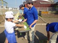 5月19日、3年生が総合的な学習の時間に、宮ネギの苗を体育館南にある学校の畑に植えました。栃木農業高校農業科3年の「野菜」を選択した生徒8名と教員2名が、宮ネギの歴史や植え方の指導をしてくださいました。同高校では宮ネギを研究していて、地元の子供たちと栽培してみたいという依頼を受けたものです。