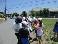 5月19日(金)・22日(月)に、学校の周りを3年生全員で探検してきました。1日目は、学校の西側から南側を通って北側へ。2日目は北側から東側へ。同じ学区内であっても、自分たちが住んでいる地区ではないと、初めての発見がたくさんあったようです。田んぼや畑の多い南側、住宅の多い北側、車通りが激しいバイパス,お店、神社等々・・・歩きながら「ここ、〇〇ちゃんちだよ!」なんて歓声を上げながら、暑さにも負けずに、楽しく歩いてきました。