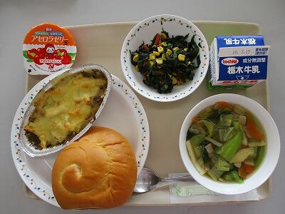 ☆はちみつパン 手作りグラタン ほうれん草のソテー 白菜スープ アセロラゼリー☆