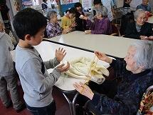 3月7日(水)5校時、近くの福寿園に、2年生全員で行ってきました。おじいちゃん・おばあちゃん達に喜んでもらえるよう、2年生なりに考えて、合唱・音読発表やあやとり・折り紙・お手玉の交流をしました。元気いっぱいの発表にお年寄り達は大喜び。たくさん拍手をもらいました。また、子ども達は折り紙やあやとりのやり方をやさしく教えたり、一緒にお手玉を楽しんだりしてとても楽しい時間を過ごすことができました。最後に大きなメダルのプレゼントをいただきました。また、行きたいですね!!