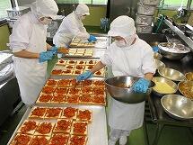 ピザトーストは、調理員さんが一枚一枚、パンに具材をのせて焼いて作っています。パンを並べる人、ピザソースをのせる人、ピザソースを塗る人に分かれ、最後にとけるチーズを上からかけてオーブンで焼きました。ピザにすると、野菜もおいしく食べられますね。