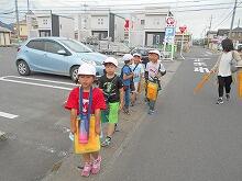 ↑ 次に通学班の班長さんと班のみんなでお互いにあいさつをしてみました。高学年が手本となるようなあいさつを率先して行います。