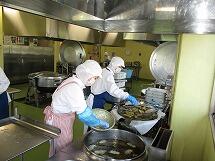 今日は、皆さんの大好きなカレーライスです。調理場では、約450人分作っているので、カレーに使うじゃが芋の量も30Kgくらいになります。二種類のカレールウをブレンドし、りんごのすりおろしや脱脂粉乳を入れたおいしいカレーです。