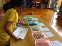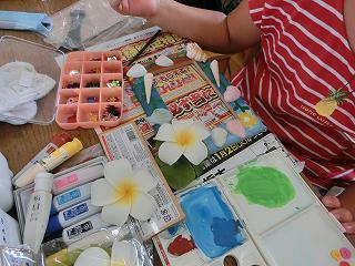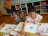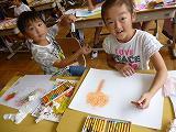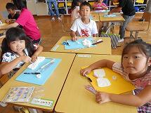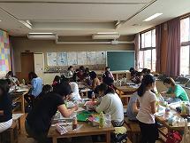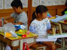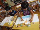 紙粘土で形を作り乾かしたので、今日は色を付けました。思い思いの色を選び、筆に絵の具を付けて丁寧に塗りました。絵の具を使った後は、綺麗に洗い干しました。1学期より洗い方が上手になりました。