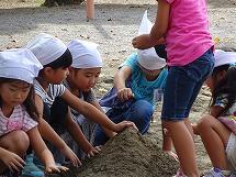 積み木を使って、形遊びをしました。高くつんだり好きな形を作ったり、グループで協力して楽しく活動できました。この後、「三角形 四角形 筒の形 さいころの形」 など、形の名前を覚えました。次の作品名はどの作品でしょうか、お子さんに聞いてみて下さい。