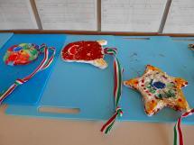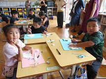 図工で紙粘土を使い、自分の好きな形を作りました。そこに、身近にある物で型を押して自分だけの模様を作って楽しみました。星やハート、電車やリボンなど様々な形ができました。紙粘土が乾いたら、来週は、絵の具で色を付けたいと思います。