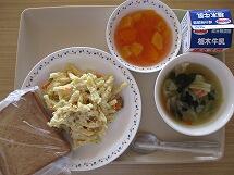 今日の給食のメニューは、「手巻きバターロールパン 牛乳 ササミチーズフライ 海藻サラダ レタスと卵のスープ」でした。