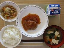 今日の給食のメニューは、「ごはん 牛乳 照り焼きハンバーグ ウインナーともやしのソテー 豆腐と野菜のスープ」でした。
