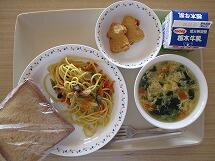 今日の給食のメニューは、「ミニ黒食パン 牛乳 和風スパゲティ いかナゲット 卵入り野菜スープ」でした。