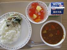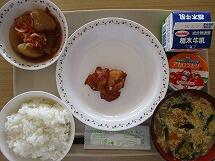 今日の給食のメニューは、「ごはん 牛乳 チキンカレー 小松菜としめじのソテー とちおとめゼリーのナタデココフルーツ」でした。