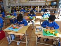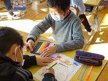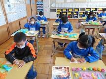 3学期が始まり、1年生はみんな元気に登校しています。図工の時間にお花紙(様々な色の薄い紙)で好きな形を作りました。