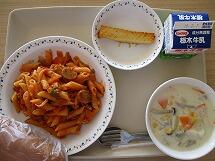 「ペンネ」は、筒状のパスタのことです。形がペンの先に似ていることから、ペンネと呼ばれるようになったそうです。アラビアータは、イタリア語で、唐辛子風味のトマトソースのことをいいます。給食では、子供達が食べやすいように辛みをおさえて作っています。にんにくの香りと、トマトの酸味が食欲をそそりますね。