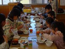 また、インフルエンザが流行しており、欠席者の多い3年と6年は、他の学年への感染を防ぐため、いつものランチルームではなく、それぞれの教室で給食を食べました。先生方に協力していただき、食器や給食の食缶は階段をつかって運び、オープンスペースで配膳をしました。給食を食べる時は、グループを作らず、全員前を向いて食べています。おしゃべりせず、静かに給食を食べていました。早く元気になって、またみんなで一緒にランチルームで給食が食べられるといいですね。