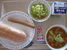 今日の給食のメニューは、「セルフホットドッグ 牛乳 キャベツのソテー お豆のスープ」でした。