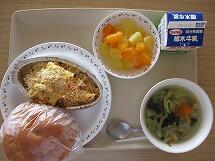 今日の給食のメニューは、「ミニはちみつパン 牛乳 手作りグラタン 野菜スープ レモンのジュレポンチ」でした。