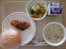 今日の給食のメニューは、「ココア揚げパン 牛乳 クリームシチュー ブロッコリーとコーンのサラダ」でした。