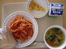 今日の給食のメニューは、「ミニ黒食パン 牛乳 ツナのトマトスパゲティ スペイン風オムレツ 白菜スープ」でした。