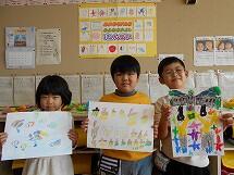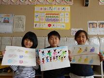 4月の図工の時間に「じぶんマーク」を作りました。そのマークを元にしたり、新しく形を考えたりして、色や模様を変えながら仲間を増やしました。どんな仲間が増えたか見て下さい。