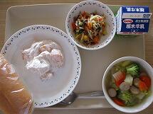 今日の給食のメニューは、「ミニアップルパン 牛乳 醤油ラーメン ささみチーズフライ ほうれん草ともやしの中華サラダ」でした。
