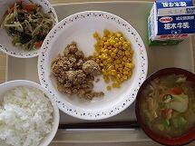 今日の給食のメニューは、「三色丼(鶏そぼろ・コーンソテー・ごまあえ) 白菜と油揚げのみそ汁」でした。