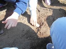 種芋を半分に切り、切り口に灰を付け、土に肥料をまいてから