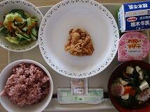 今日の給食のメニューは、「赤飯・ごま塩 牛乳 鶏の唐揚げ ゆで野菜サラダ 豆腐のすまし汁」でした。