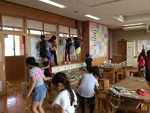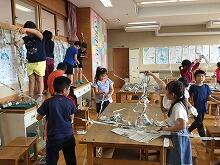 切り終わったあとは、図工室いっぱいに切った紙を張り巡らせ、「クモの巣みたいだ!」と大喜び