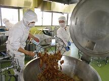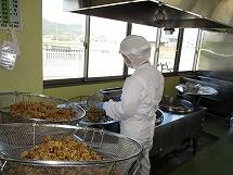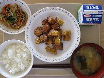 今日の『かつおの揚げ煮』は、角切りのかつおに下味をつけ、片栗粉をつけて油で揚げた物と、高野豆腐を揚げた物を甘辛いたれでからめて作りました。何人もの調理員さんの手がかかっています。残さず食べましょう。
