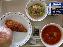 今日の給食のメニューは、「丸パン 牛乳 白身魚フライ キャベツのソテー ミネストローネスープ」でした。