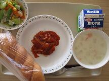 今日の給食のメニューは、「ツイストミルクパン 牛乳 ハンバーグトマトソース アスパラガスのイタリアンサラダ クラムチャウダー」でした。