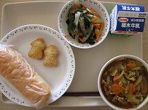 今日の給食のメニューは、「ミニパインパン 牛乳 いかナゲット 海藻サラダ カレーうどん」でした。