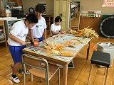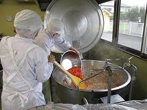 給食室では、なすが苦手な子供達のために、皮をまだらに剥き、油で揚げてから調理しています。また、生のトマトを「湯むき」という方法で、一つ一つていねいに皮をむいてスパゲティソースを作っています。おいしいトマトソースなので残さず食べましょう。
