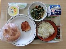 今日の給食のメニューは、「丸パン 牛乳 チキン竜田サンドの具 ゆでキャベツ ひよこ豆のミネストローネスープ」でした。