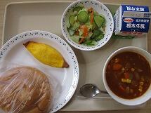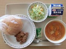 今日の給食のメニューは、「コッペパン 牛乳 ミートサンドの具 ヘルシーサラダ よくばりスープ」でした。