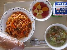 今日の給食のメニューは、「ミニ黒コッペパン 牛乳 スパゲティナポリタン ウインナーともやしのスープ ぶどうのジュレポンチ」でした。