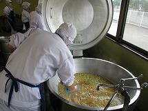 今日は、みなさんの大好きなココア揚げパンです。揚げパンは、給食室で約420個のコッペパンを油で揚げ、熱いうちにココアパウダーと砂糖をまぶして作っています。ココアはチョコレートと同じ、カカオ豆を原料とする食品です。