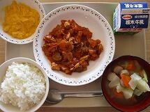 今日の給食のメニューは、「ごはん 牛乳 ピリ辛まぜご飯の具 小松菜と卵のスープ フルーツヨーグルト」でした。