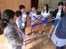 内容は「くものすおにごっこ」です。校庭に書かれた線の上を逃げたり追いかけたりするおにごっこです。各グループ低学年と高学年に分かれ1分間に逃げきれた人数を競い合いました。