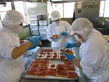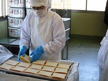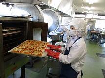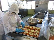 ピザトーストは、給食室で1枚1枚手作りしています。食パンを並べる人、ピザ-ソースをのせて塗る人、チーズをかける人、オーブンで焼く人、できあがったピザトーストを数えてバットに入れる人。たくさんの調理員さんが携わって作ってくれています。耳までよく噛んで残さず食べましょう。