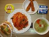今日の給食のメニューは、「クロワッサン 牛乳 スパゲティナポリタン エビフライ キャベツともやしのスープ プリン」でした。