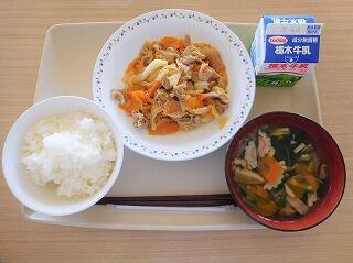 今日の献立は、ごはん、牛乳、豚肉のしょうが焼き、キャベツの味噌汁です。