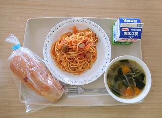 今日の献立は、チーズパン、牛乳、ナポリタン、野菜スープです。