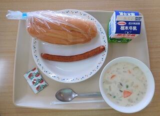 今日の献立は、ホットドッグ、牛乳、白インゲン豆のクリームシチューです。